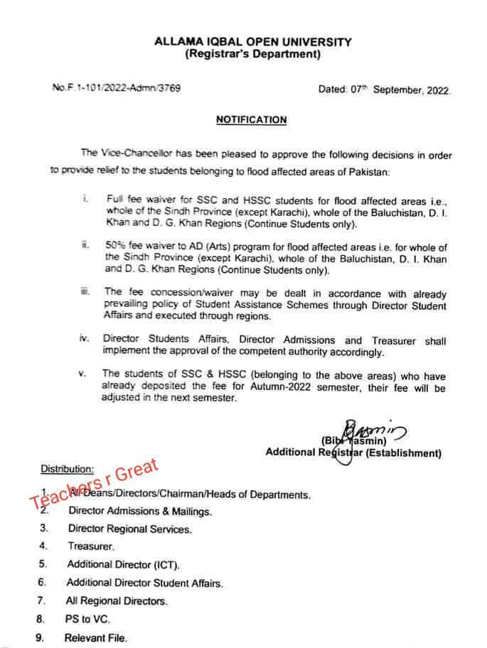 The Allama Iqbal Open University issued the latest notification regarding the fee reduction. According to the latest notification, we are glad to inform all that the Allama Iqbal Open University AIOU decided to waive the fee of the applicant who was badly affected by the flood.