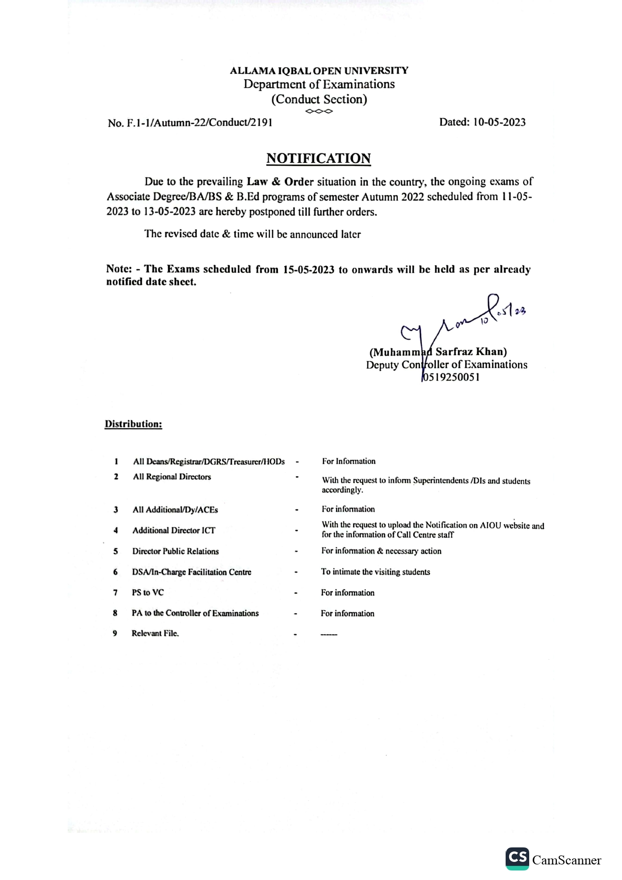 The Allama Iqbal Open University AIOU postponed BA/BSc and B.ed Exams 2023 from 11 May to 13 May 2023. The university issued the official notification regarding the cancellation of papers on 10 May 2023 on the website. So, the ongoing autumn exams are postponed now.