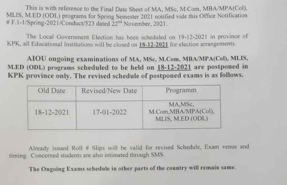 On Thursday, the AIOU Controller Exams, Dr Tauqir Ahmad Khan, tweeted graduate papers. According to the latest tweet, it is to notify you all that the AlOU postponed the graduate degree exams all over KPK province. Earlier, the exams were scheduled to be conducted on 18th December 2021, but now due to the local bodies election in KPK, they postponed the exams. Now, the exams will be held on 17th January 2022. All other dates shall remain the same as the already announced date sheet. No change in Punjab, Sindh, Balochistan, AJK,GB,ICT. However, AIOU only changed the date of KPK province.