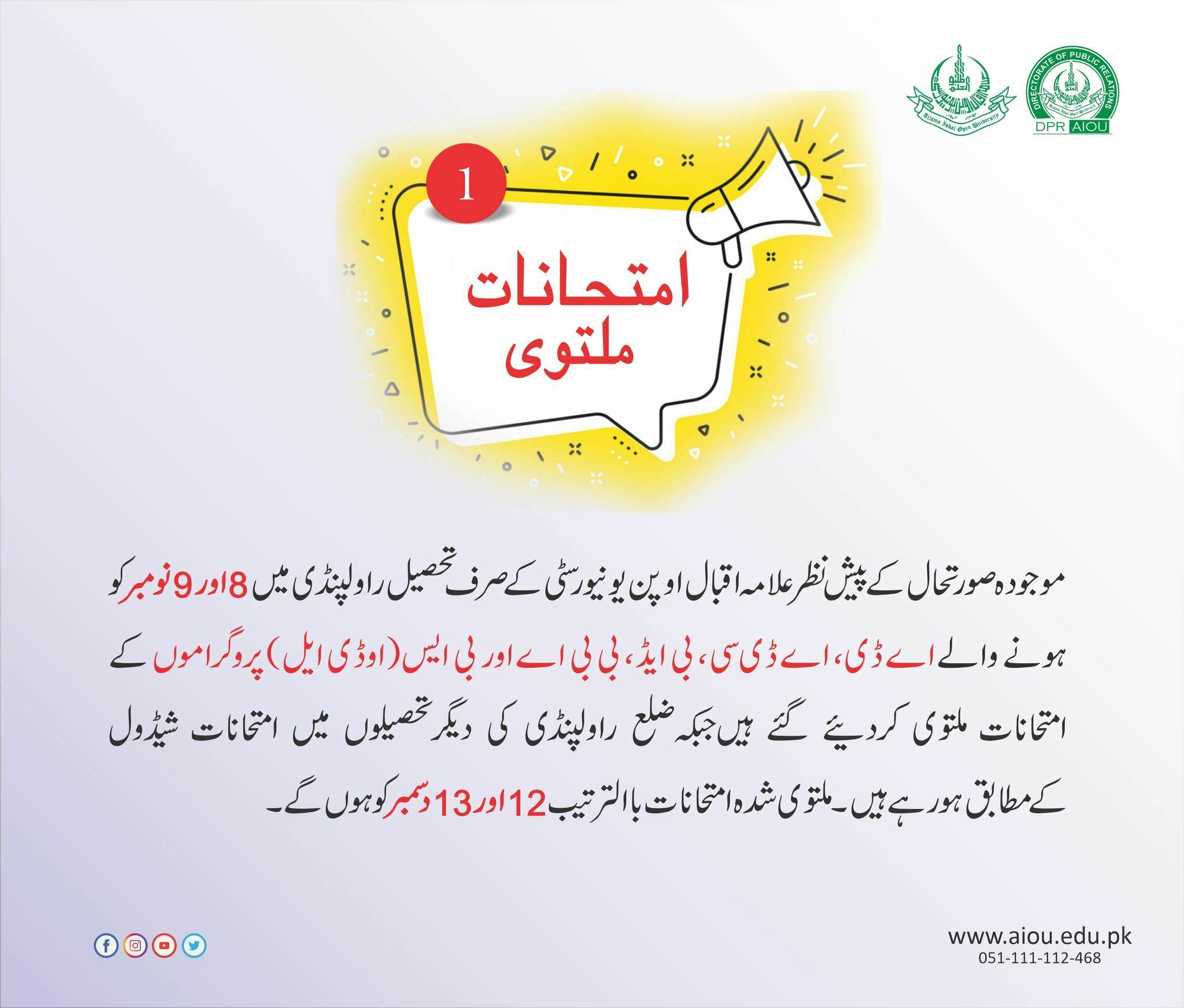 AIOU Revised Dates for Postponed Exams in Rawalpindi