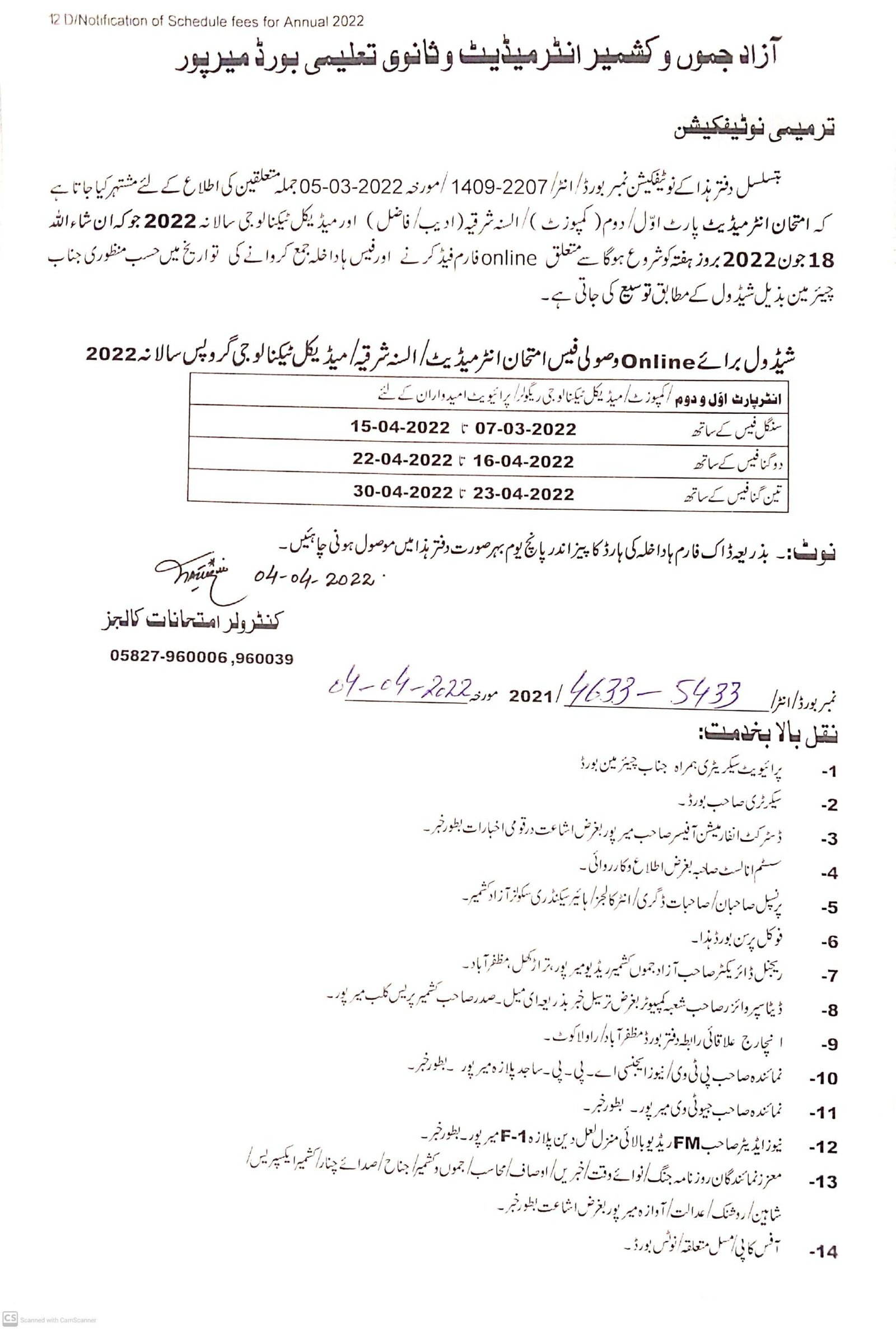 The Board of Intermediate and Secondary Education BISE AJK issued a notification regarding the extension in submitting the annual examination fee for Intermediate (Part I and II). BISE Azad Jammu Kashmir issued this notification for composite, medical technology, and regular, private candidates. Now, the candidates will submit the annual examination admission single fee till 15th April 2022, while the date for submission of double fee starts on 16th April and ends on 22nd April 2022. However, the date for submission of the triple fee is from 23rd April 2022 to 30th April 2022.