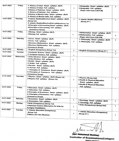 The timing of the morning paper is 8:30 AM, while the timing of the evening exam is 1:30 PM. It is also pertinent to mention that the evening Session Paper on Friday will start at 2:30 PM. This date sheet of HSSC-I is valid for all Punjab boards, including Lahore, Faisalabad, Multan, Rawalpindi, Sialkot, Sahiwal, Bahawalpur, Sargodha, and DG Khan.