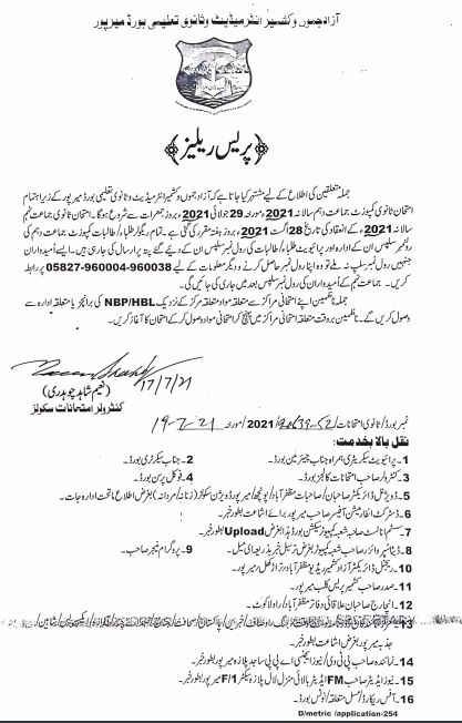 The Azad Jammu and Kashmir Board issued a notification regarding the matric (9th, 10th) annual exams 2021. According to the notification, the AJK Board will conduct the 10th class exams from 29 July 2021, while the 9th class exam will begin from 28 August 2021.
