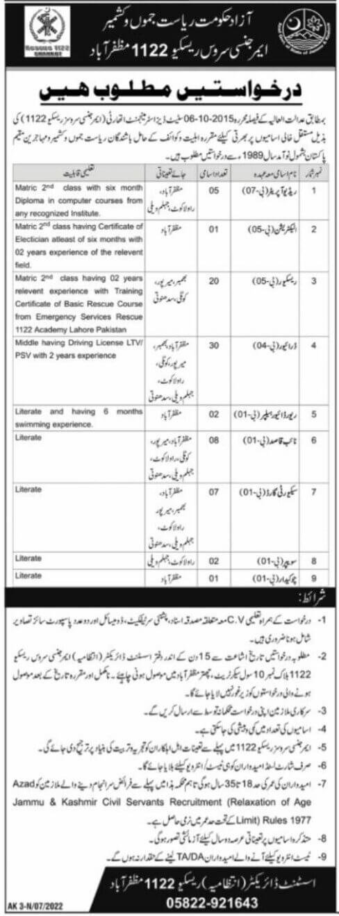 The Azad Jammu & Kashmir Emergency Service Rescue 1122 has advertised the latest jobs in 2022. The announced posts on the AJK 1122 Muzaffarabad are for the Rescue Leader posts. According to the advertisement, the AJK Emergency Rescue service needs 02 candidates for the Rescue Leader in districts Kotli and Sadhoti. Thus, interested applicants can apply for the AJK 1122 latest jobs by submitting the application to the concerned office. However, the last date for the announced AJK 1122 posts is 21 July 2022.