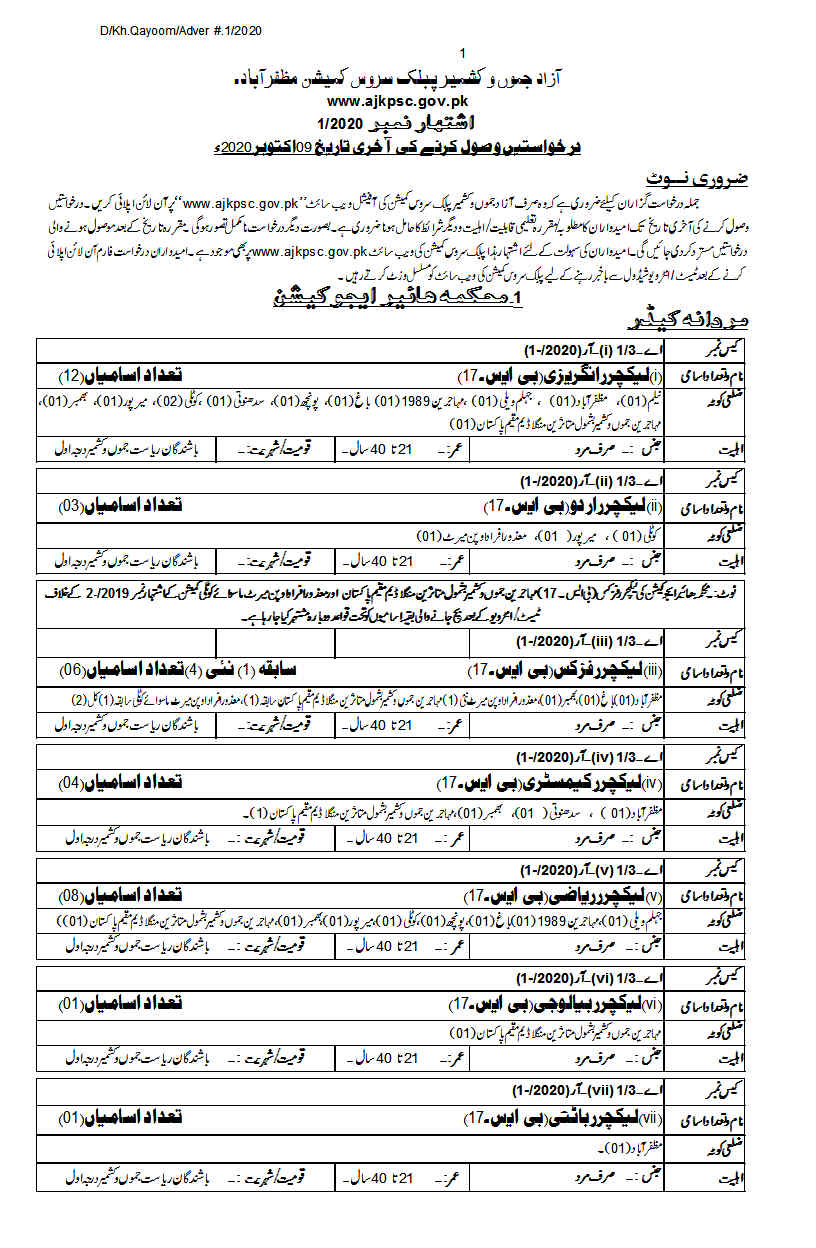 AJKPSC has announced the vacancies of the lecturer jobs for males in the following subjects.