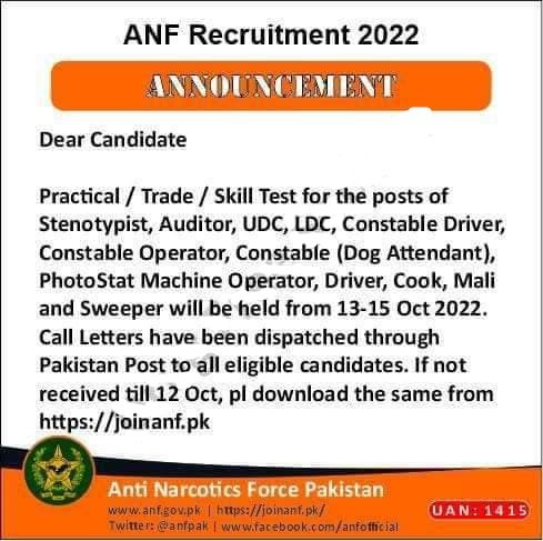 The Anti-Narcotics Force announced the Roll Number Slips for the skill/practical tests of the following job positions.