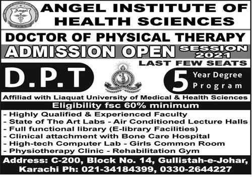 Recently, the Angel Institute of Health Sciences (AIHS) Karachi announced the admission of 2021 for the DPT. Thus, candidates having min. 60% marks in the FSC Pre-Medical can apply for the DPT. However, the institute is affiliated with the Liaquat University of Medical and Health Sciences. Thus, interested candidates can apply till 24 April 2021.