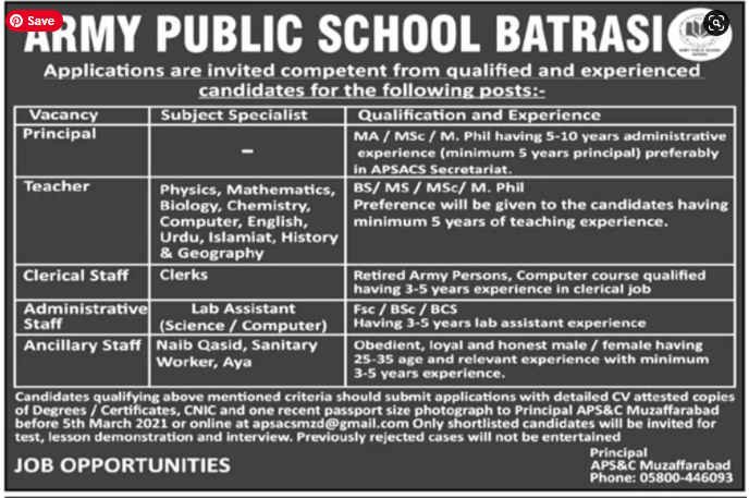 The Army Public School Batrasi announced the various jobs for teaching and non-teaching staff. It is an excellent opportunity for those who want to work in a well-reputed and most demanding institution. Thus, well-qualified and experienced candidates must apply for the announced positions before the last date. The deadline to apply in APS Batrasi 05 March 2021.