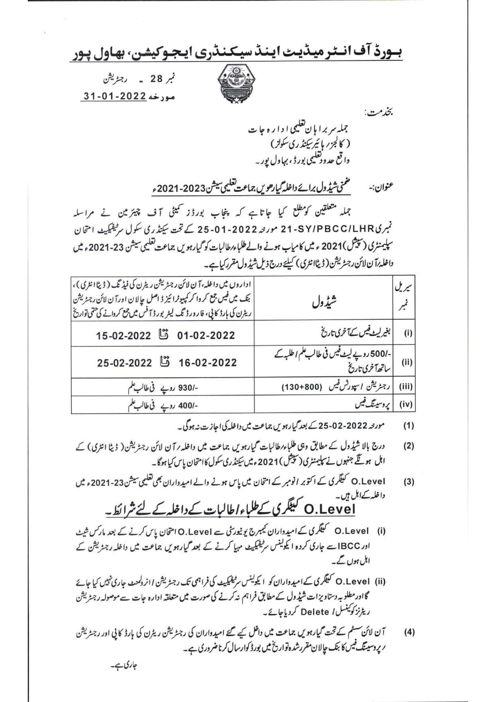 Bahawalpur Board 11th Class Admission Schedule 2021-23 For Special Exam Students