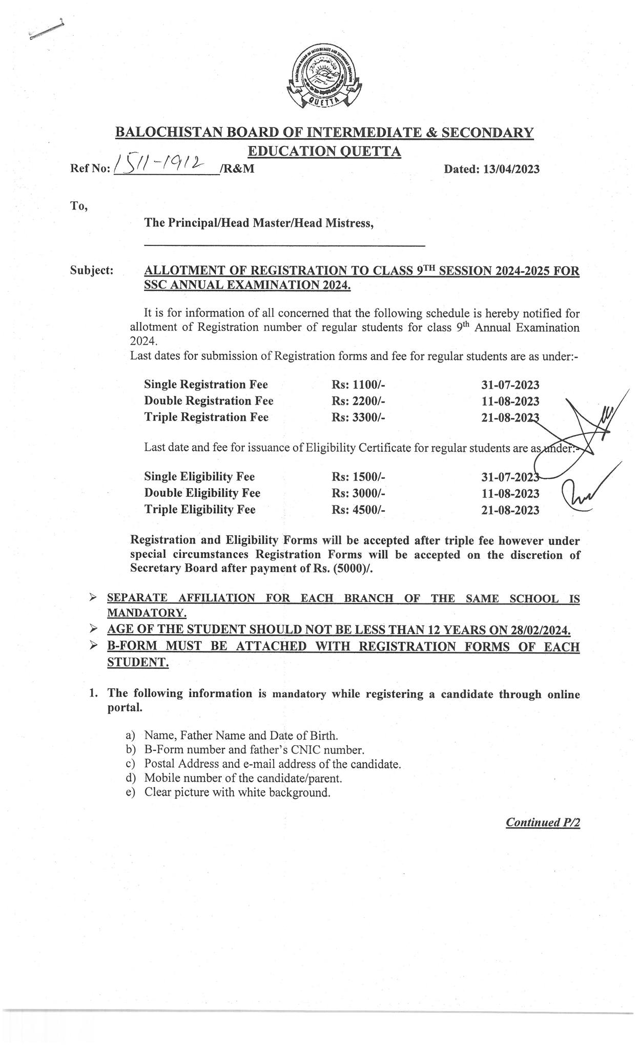 - All Punjab Board 9th Class Online Registration Schedule 2023-25
