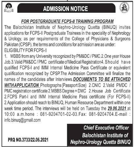 Here are the eligibility criteria for the Balochistan Institute of Nephro Urology Quetta admissions for the FCPS-II training program.