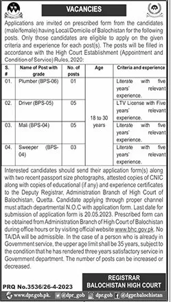 Are you looking for high court jobs in 2023? If yes, then you do not need to worry at all. Today, the Balochistan High Court invites applications for the latest job opportunities. Both males and females can apply. They are looking for well-motivated and talented individuals for the position of plumber, driver, mali, and sweeper. The total number of job posts is 14. The age limit required for these jobs is 18 to 30 years. We mentioned the complete details of how one can apply for jobs. You can check the exact method here. The last date for submission of the application is 20th May 2023. Keep scrolling to get more details about the Balochistan High Court Jobs.