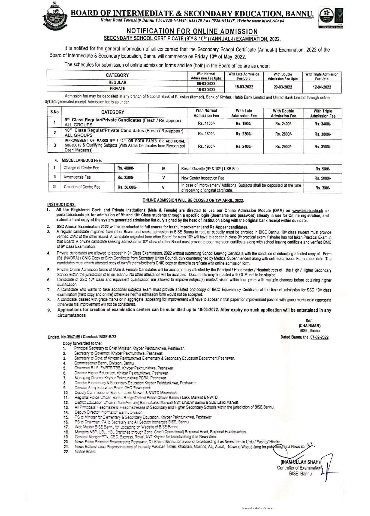 The Board of Intermediate and Secondary Education BISE Bannu issued a notification regarding the SSC annual examination 2022. According to the details, the Bannu board issued the online admission schedule and fee structure for grades 9th and 10th. The students who belong to the Bannu district and want to apply for SSC (9th and 10th) annual examination will have to follow this schedule. BISE Bannu announces the admission schedule of both regular and private candidates. The applicant will have to deposit an admission fee in any National Bank of Khyber, HBL, and UBL through online system. As pe the details, the annual examination of SSC will commence from 13th May 2022 (Friday).