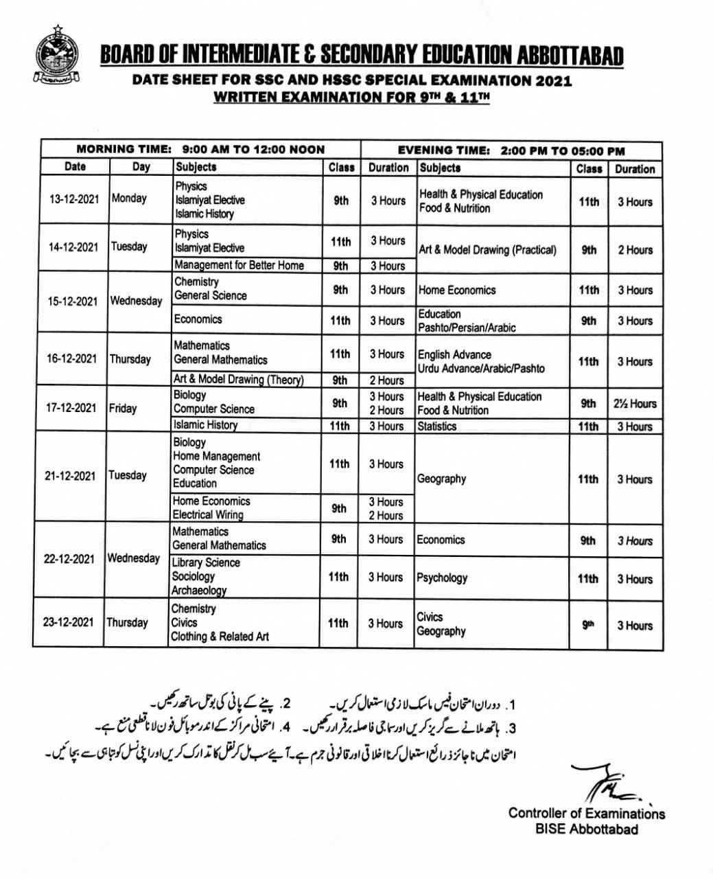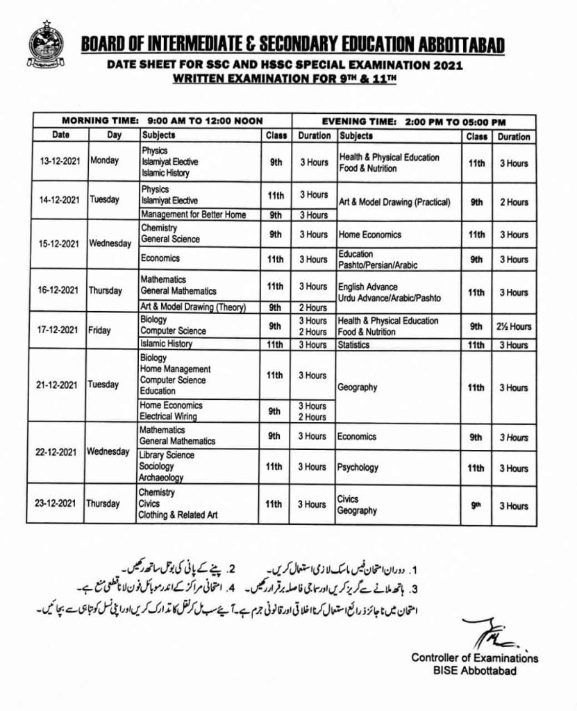 Below is the complete BISE Abbottabad date sheet of the 9th & 11th Classes for the special examination 2021.