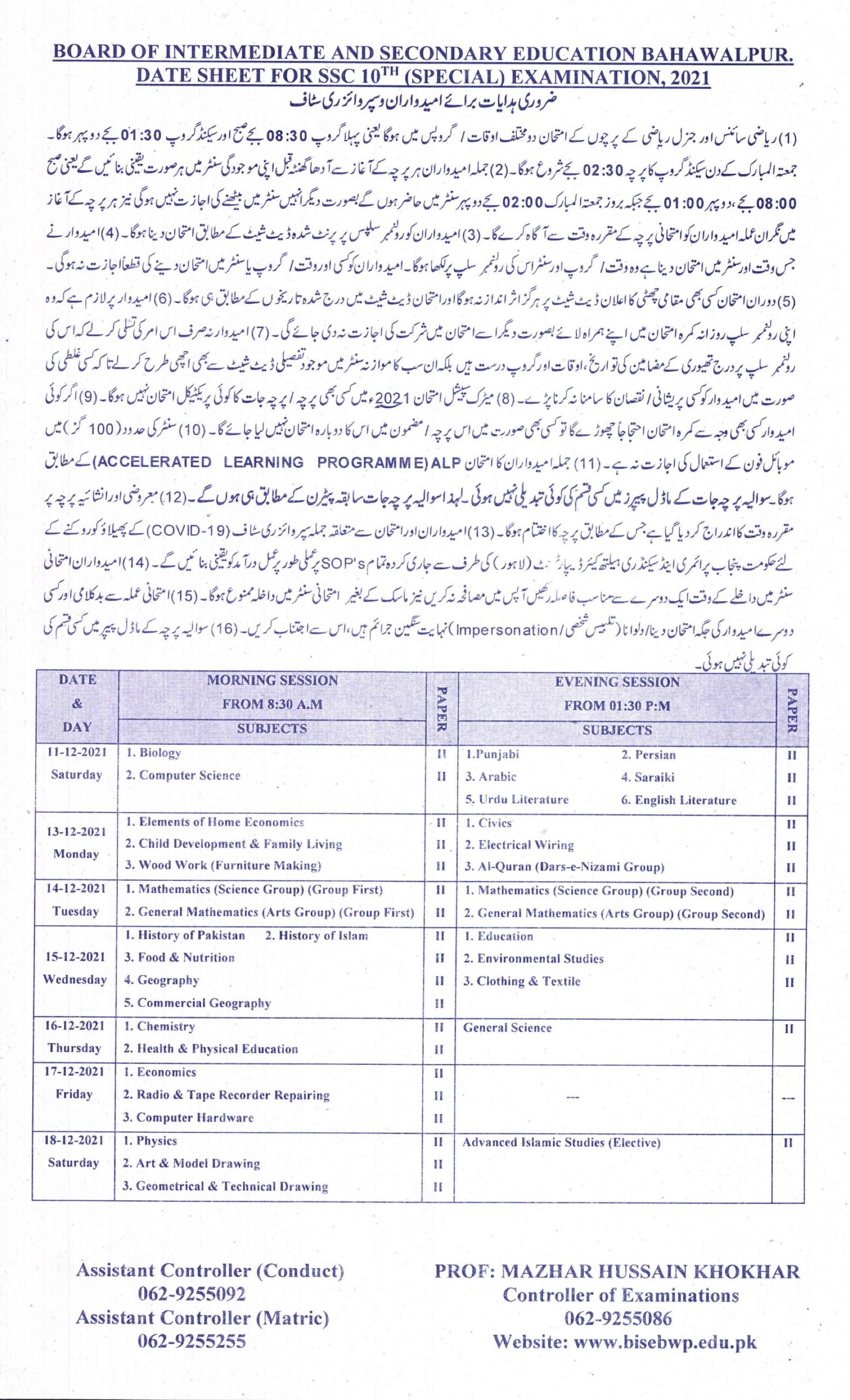 Below is the complete BISE Bahawalpur date sheet of SSC Matric (10th) for the special examination 2021.