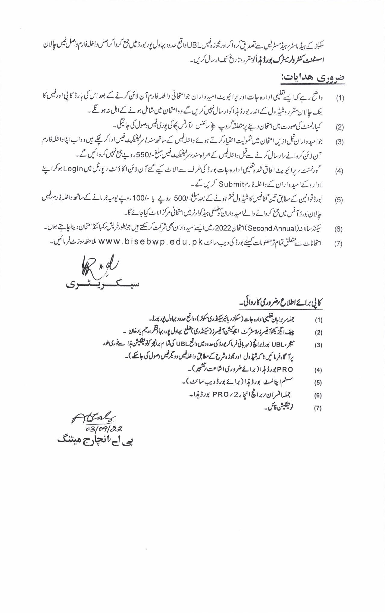 Bahawalpur BoardMatric 2nd Annual Exams Registration Schedule 2022