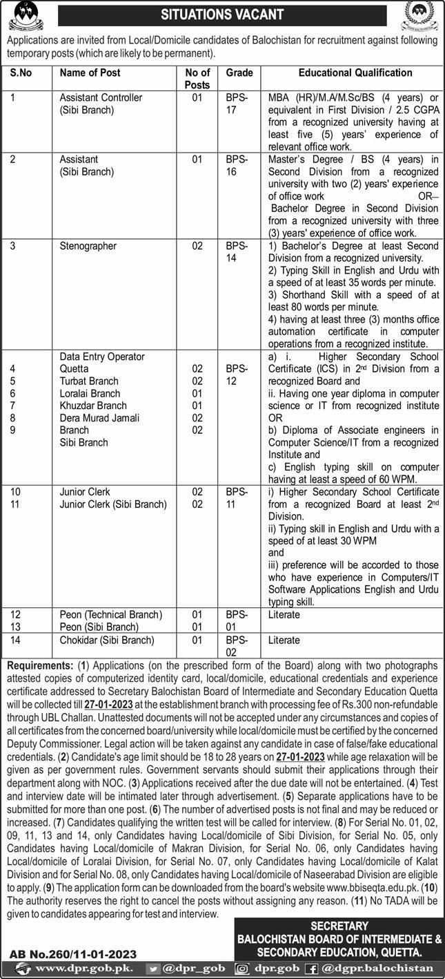 The Balochistan Board of Intermediate & Secondary announced the latest jobs for various posts. The Board required the staff of the Balochistan domicile holders temporarily (Likely to be permanent). So, the eligible candidates meeting the required criteria can apply. Thus, candidates having Master’s/Bachelor/Intermediate degrees are eligible. Below we have explained the complete detail about the BISE Balochistan jobs 2023. However, the last date for the Balochistan Board Jobs is 27 January 2023.