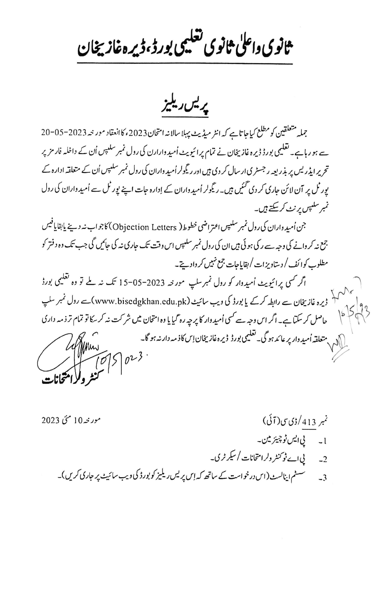 • Private DG Khan 12th Class candidates will receive their Roll Number Slips at the addresses provided on the admission forms.