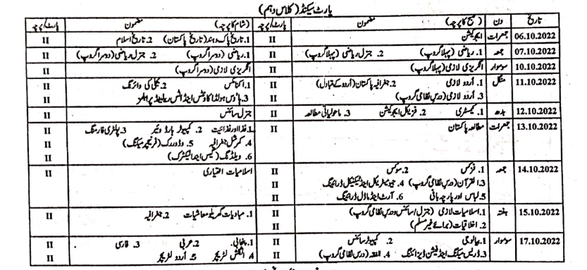 | 11-10-2022 | Urdu Geography of Pakistan Urdu Compulsory | Economics Electrical Wiring Art and Model Drawing |