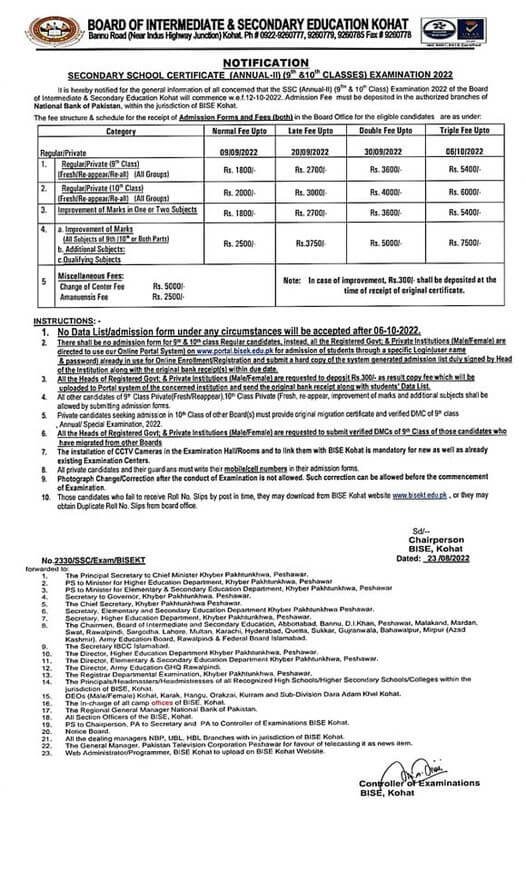 BISE Kohat SSC 2nd Annual Exams Fee Structure 2022