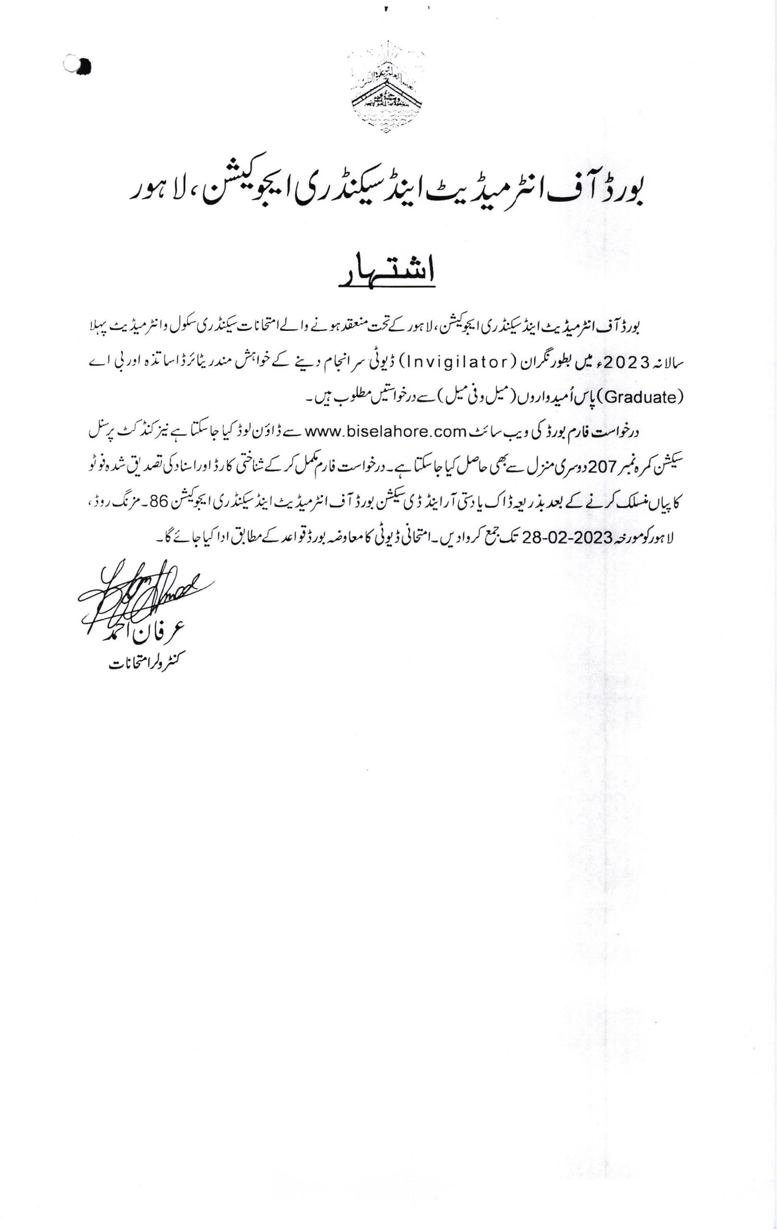The last date for submission of the BISE Lahore Invigilator Jobs 2023 application is 28th February 2023
