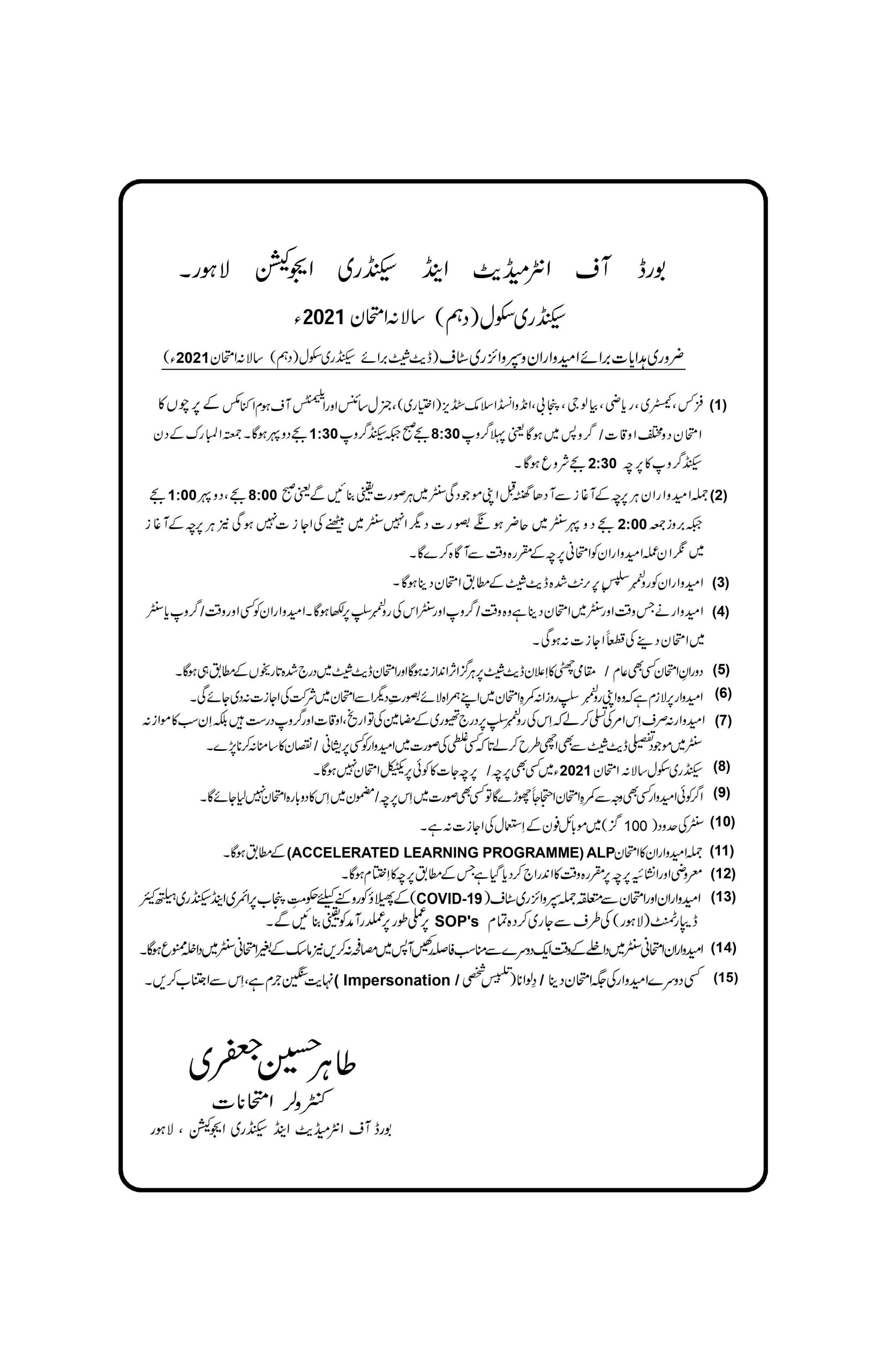 BISE Lahore SSC (Part 2) 10th Class Date Sheet 2021 | Lhr Board