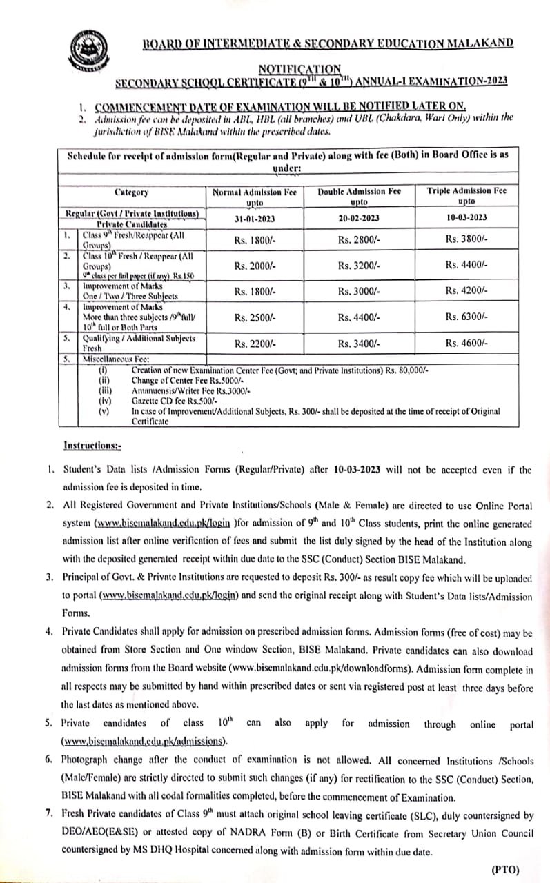 BISE Malakand SSC Annual Exams Registration Fee Schedule 2023