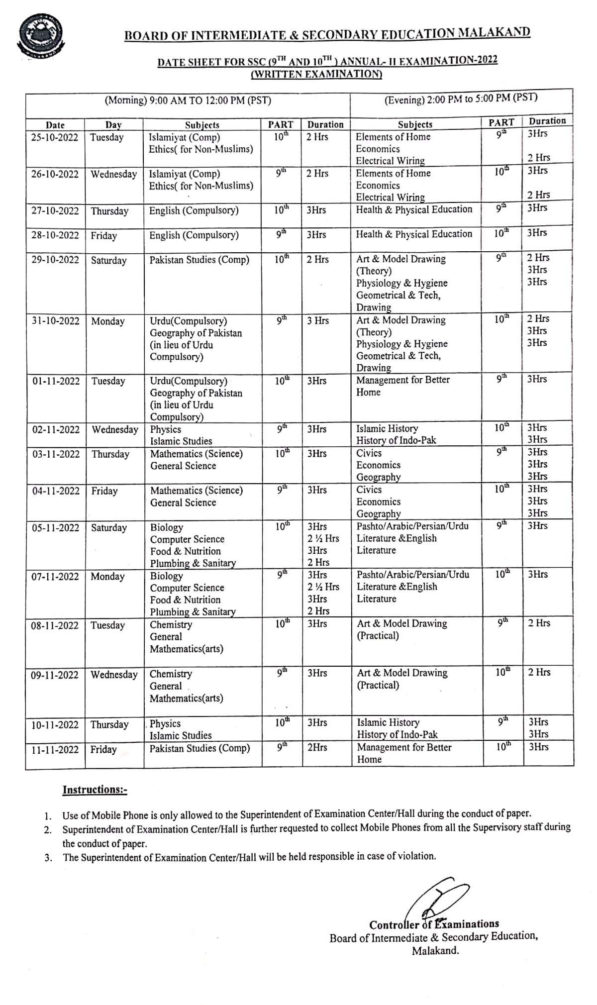| 29-10-2022 | Pak Studies | 10th | Art and Model Drawing Physiology and Hygiene Geometrical and Technical Drawing | 9th |