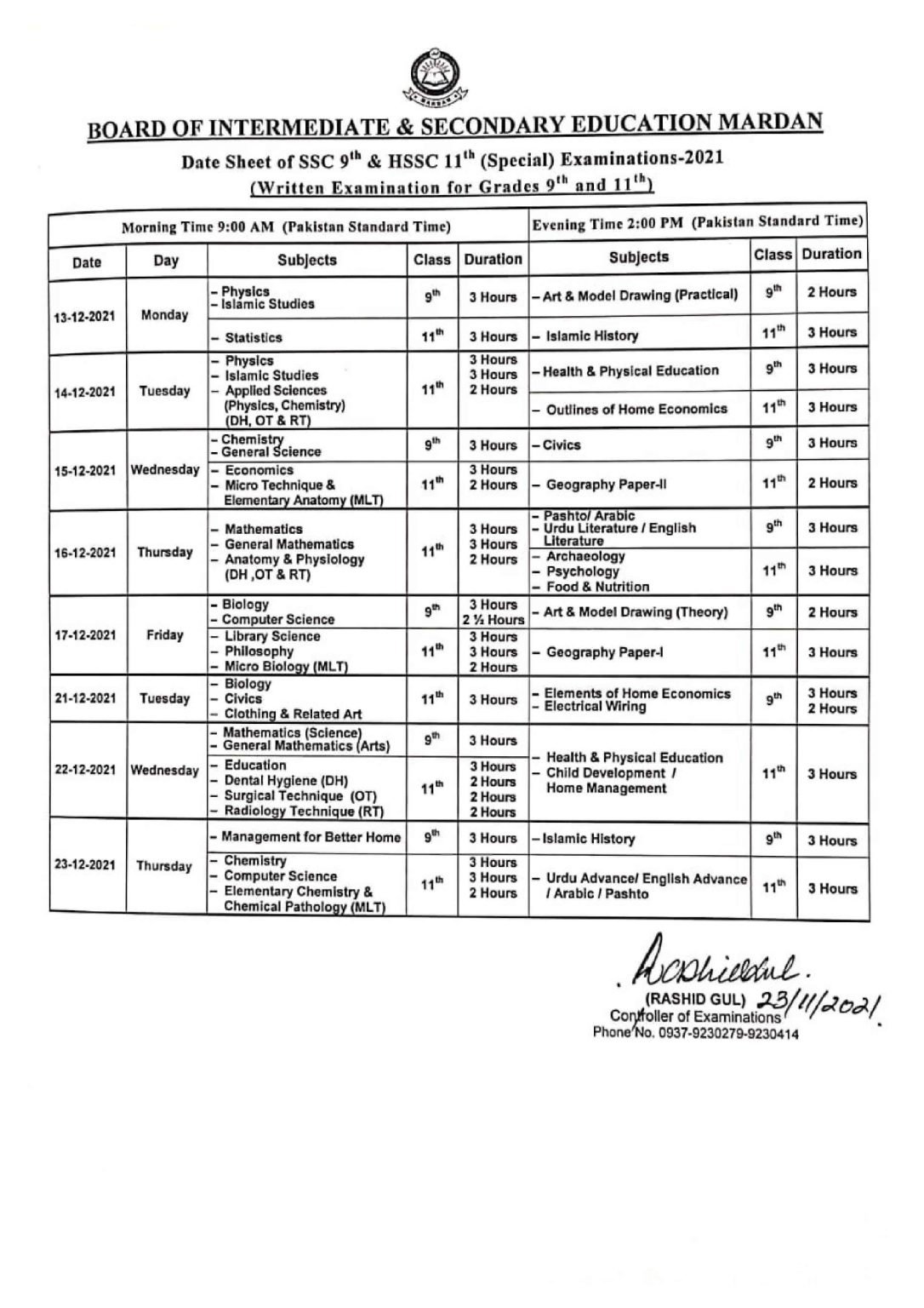 Here is the BISE Mardan 9th and 11th (SSC and HSSC Part-I) Special Exams Date sheet 2021.