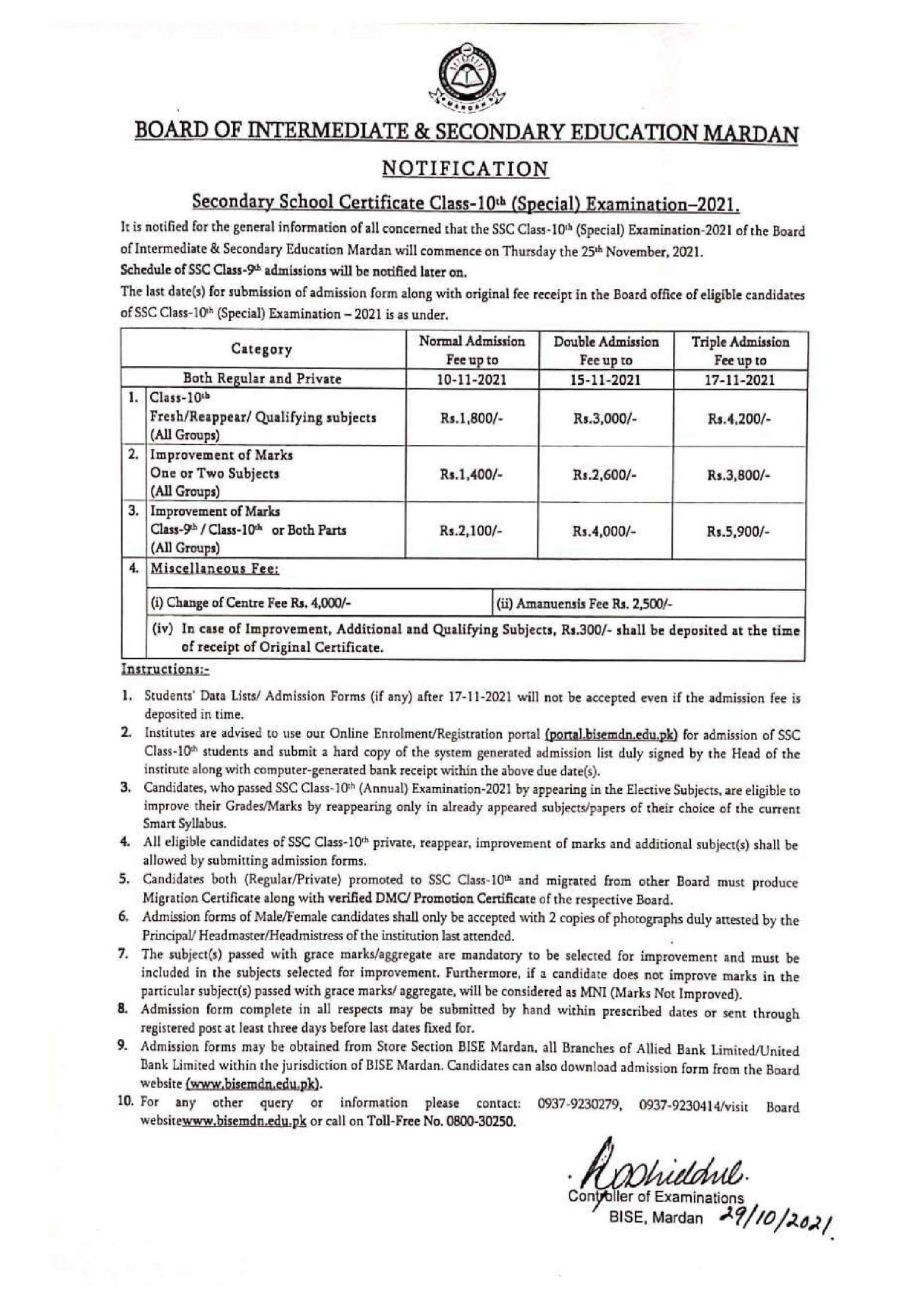 BISE Mardan SSC Special Exams Fee Structure