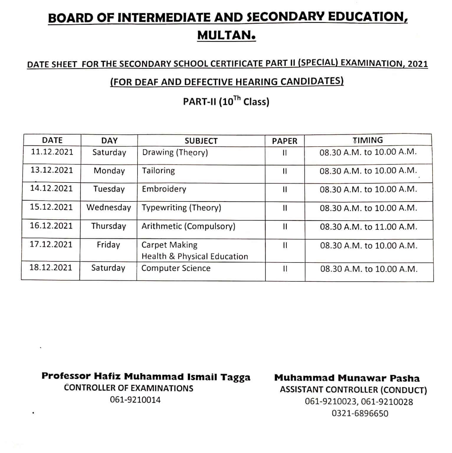 Are you looking for the BISE Multan 10th class special exams date sheet 2021 for Deaf and Defective Hearing (disabled) students? Yes, the Multan Board has announced the special exam 2021 date sheet for special students. The Multan board announced the SSC-II Special students date sheet on 26 November 2021. However, the Multan board comes under the educational boards of Punjab.
