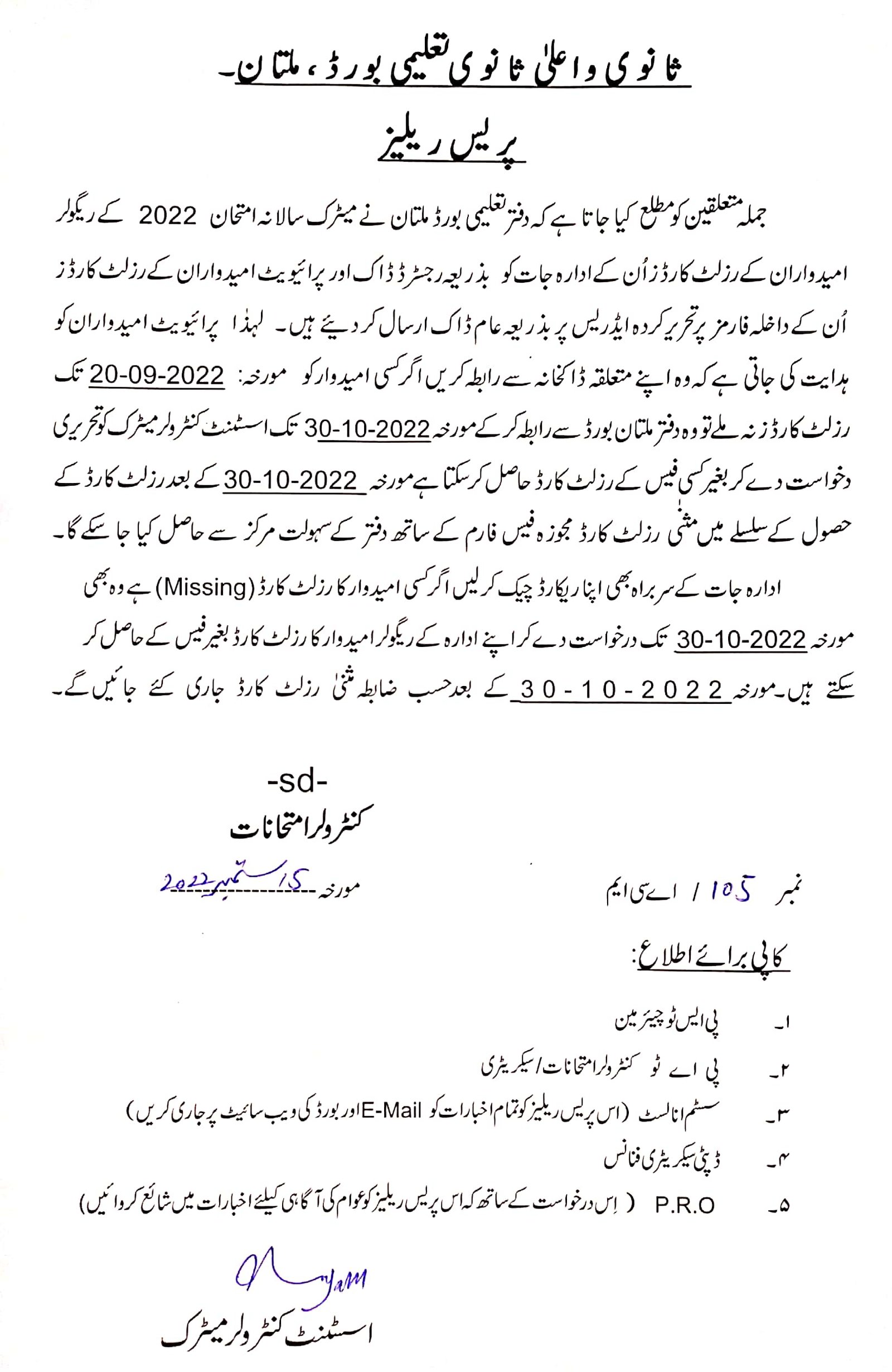 The Board of Intermediate and Secondary Education BISE Multan notified about the result card of 10th class 2022. In the latest press release, BISE Multan stated that the result card of SSC regular candidates had been sent to their respective institutes via the post office. The result card of private candidates will be sent to their postal or home addresses. The private candidates are requested to contact their nearest post office. If candidates do not receive the 10th class result by 20th September 2022, they will contact their Multan board by 30th October 2022, and the Assistant Controller will get the result card by not paying the fee.
