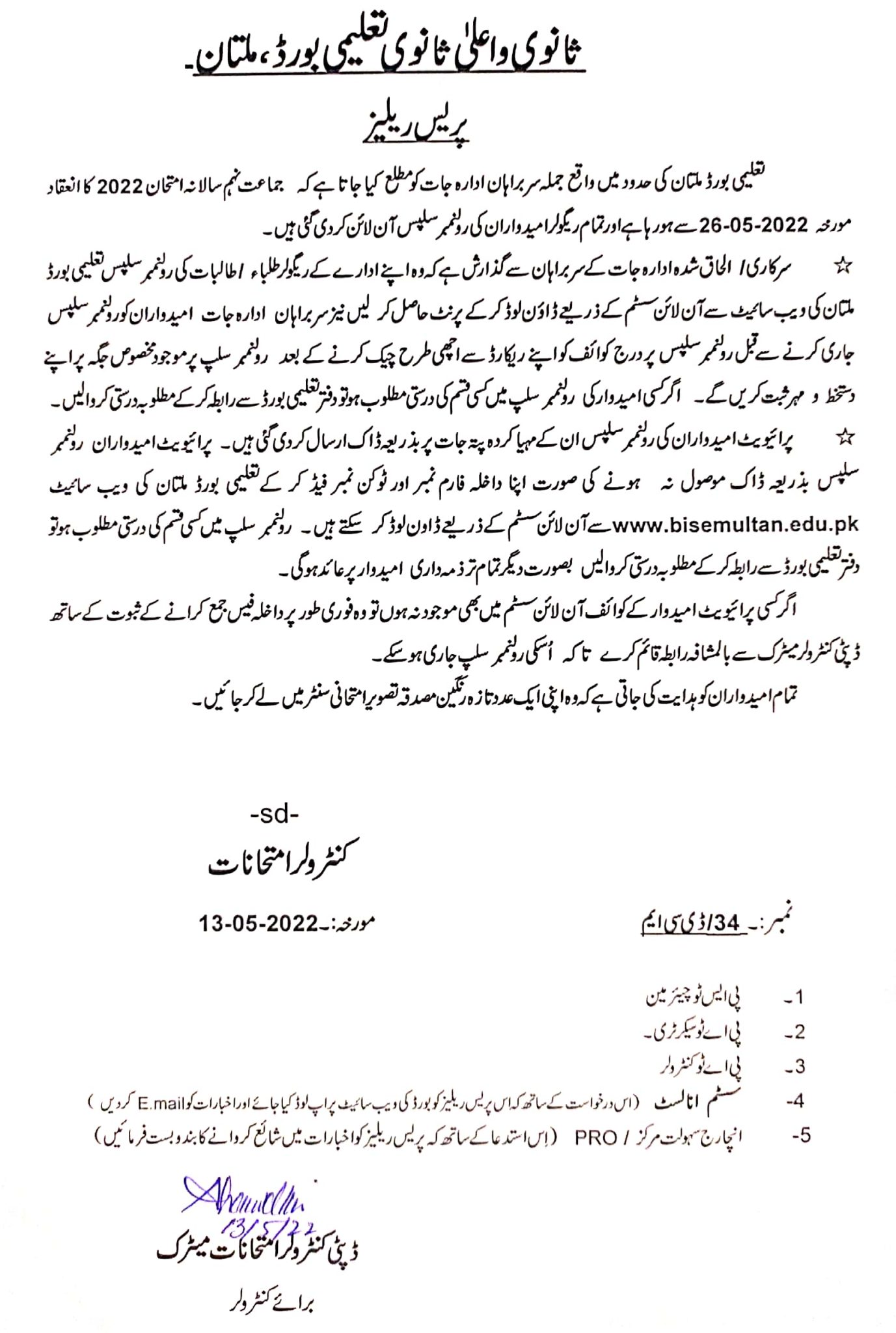 BISE Multan BISE Multan roll number slips roll number slips 2022