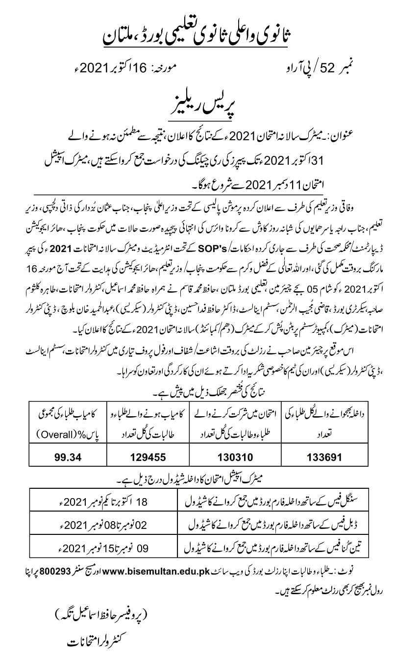 On 16th October 2021, Punjab Board released the Annual Matric Examination Results in 2021. The result was declared at 5:00 pm on the respective date. Results of all boards have announced that fall under the Punjab Educational Board. BISE Multan was also one of them.