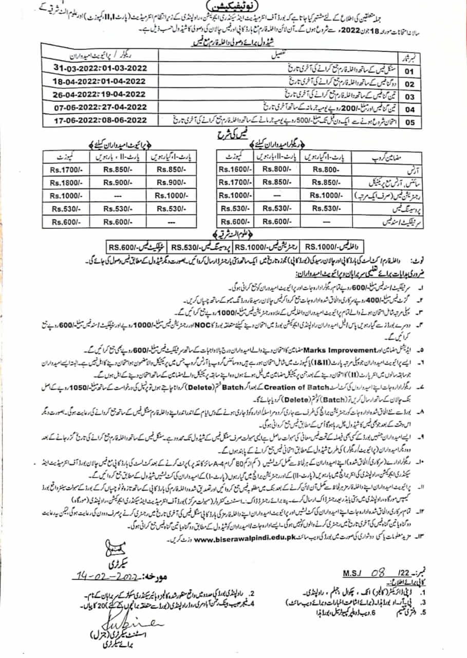 BISE Rawalpindi HSSC Annual Exams Fee Schedule 2022:-