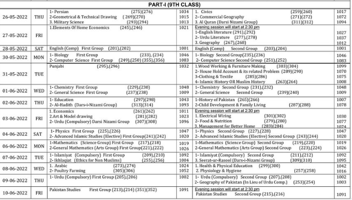 The timing of the morning paper is 8:30 AM, while the timing of the evening exam is 1:30 PM. It is also pertinent to mention that the evening Session Paper on Friday will start at 2:30 PM. This date sheet of SSC-I is valid for all Punjab boards, including Lahore, Faisalabad, Multan, Rawalpindi, Sialkot, and Sahiwal, Bahawalpur, Sargodha and DG Khan.