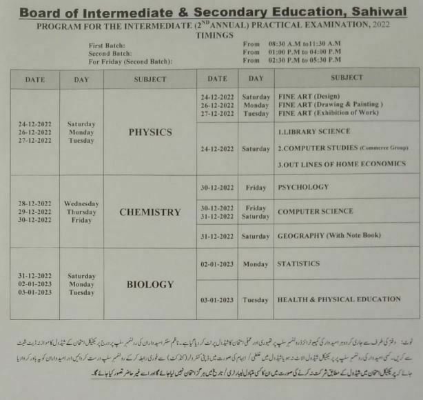 BISE Sahiwal HSSC Practical 2nd Annual Examination Datesheet 2022