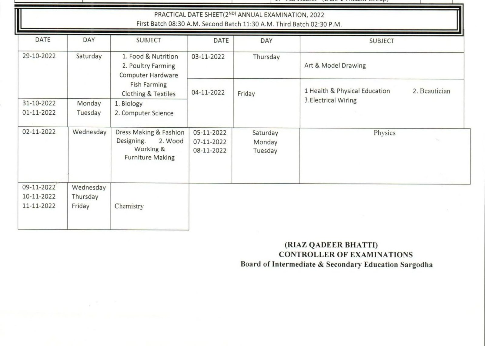 The Sargodha Board announced the following Matric 2nd annual exam date sheet 2022 for Practical Exams.