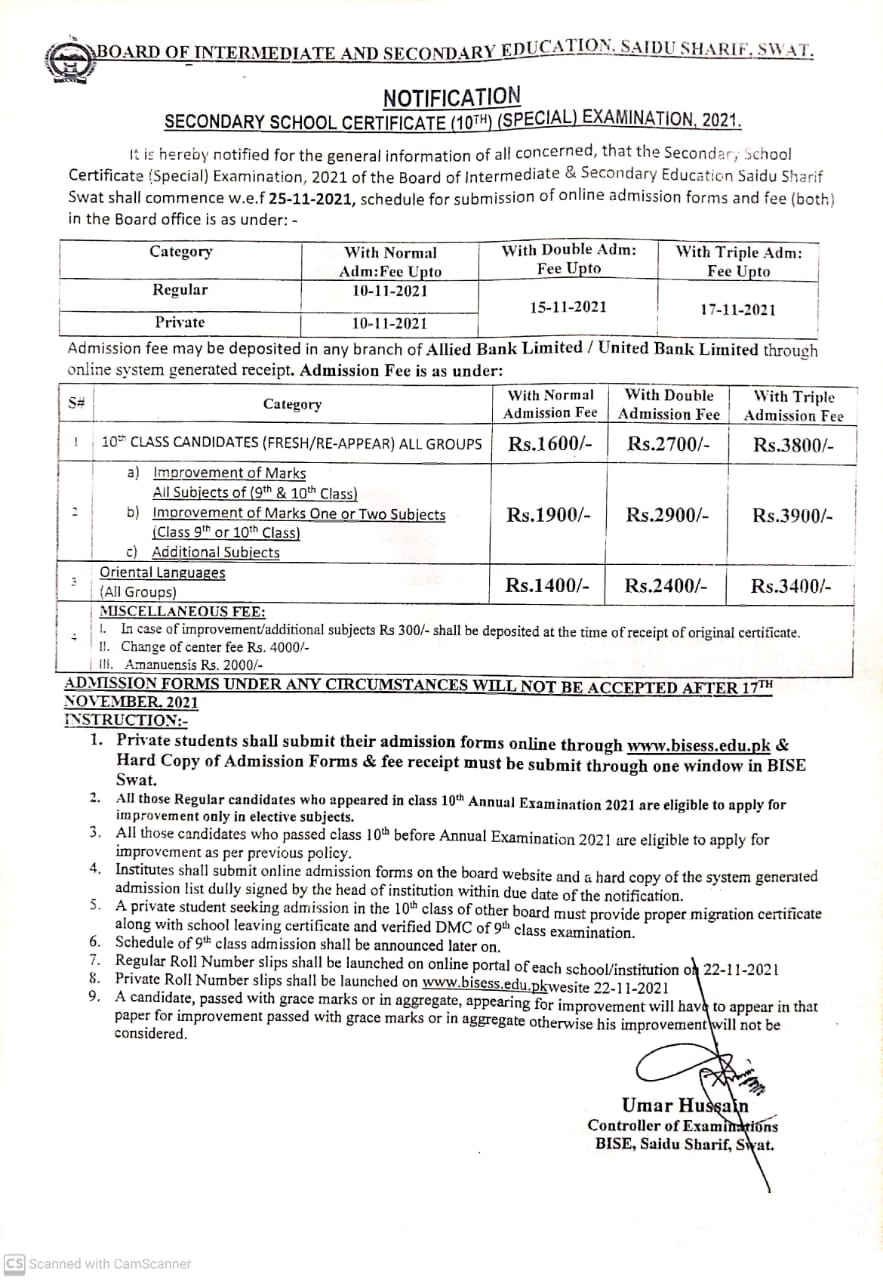 Are you waiting for special exam registration schedule? If yes, then you are definitely reached at the perfect place. According to the latest notification, it to inform all that the Board of Intermediate and Secondary Education BISE Swat issued a notification regarding the special exams 2021. They announced the detailed fee schedule as well as registration schedule of special exams. According to the registration schedule, the regular and private candidates of SSC level will submit the single fee till 10th November, while with double fee, they will have to pay till 15th November and for triple fee, SSC candidate will pay before 17th November 2021. Applications received after these dates will not accepted by the Swat Board. The special exams in KPK will commence from 25th November 2021. So what are you waiting for? Go and apply now