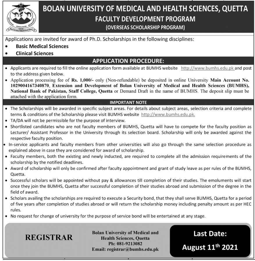 The Bolan University of Medical & Health Sciences, Quetta, announced the overseas scholarships 2021. These scholarships are for the PhD degrees in the basic science medical and clinical sciences departments under Faculty Development Program. So, interested candidates can apply for the PhD Overseas scholarship through the university website. The last date of the Bolan University Quetta Scholarship is 11 August 2021.