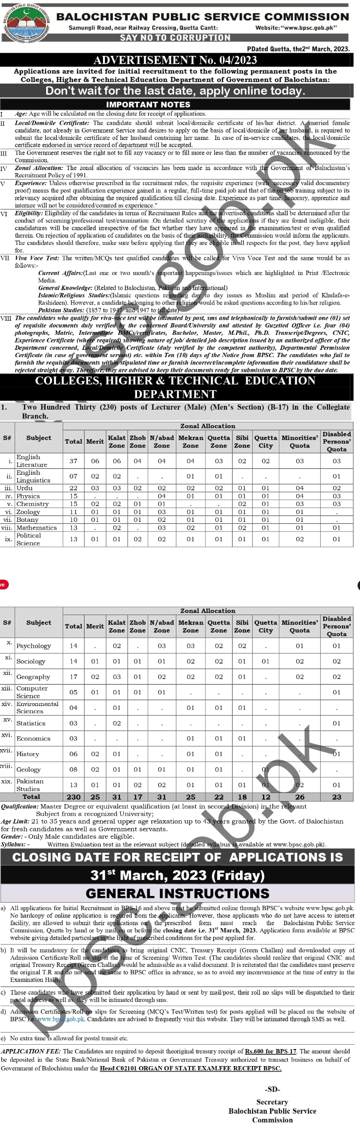The Balochistan Public Service Commission (BPSC) advertised the lecturer (Male) posts in 2023. The announced posts are for the Balochistan College, Higher, & Technical Education Department. The commission advertised 230 vacancies for the lecturer post. However, the announced vacancies are for various subjects. So, the eligible candidates meeting the required criteria can apply for the BPSC jobs. Interested candidates must submit the online application form through the BPSC website. However, the last date for the BPSC advertisement # 4/2023 jobs is 31 March 2023.