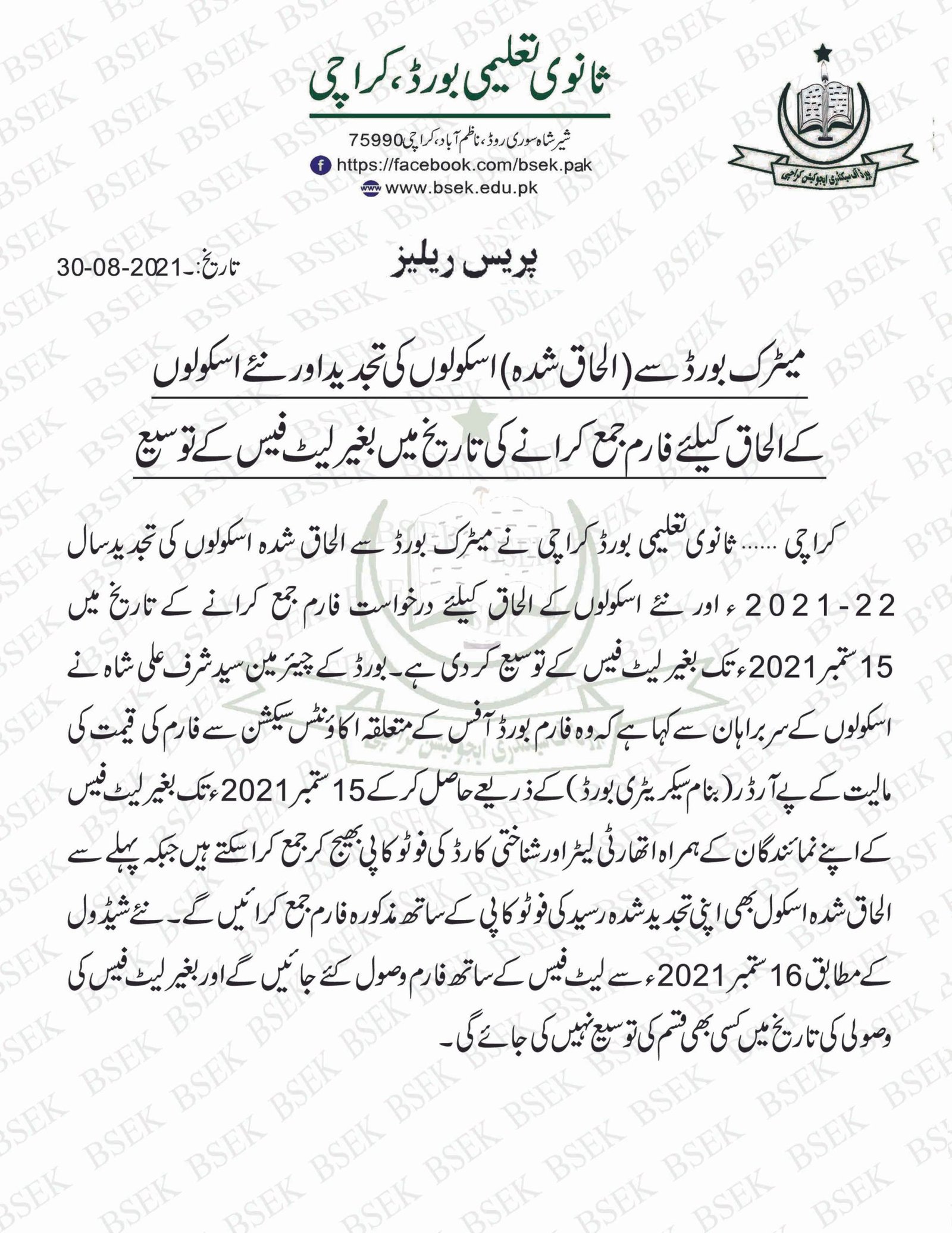 The Karachi board recently issued a notification regarding the extension in affiliation dates for schools. So, all institutes who want the affiliation and extend the affiliation for the 2021-22 session can submit their application till 15 September 2021. Thus, the school head can submit the authority letter by the mentioned date without any late fees.