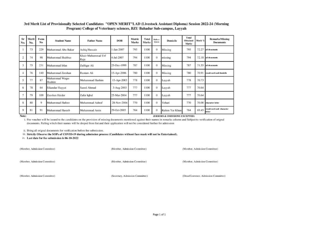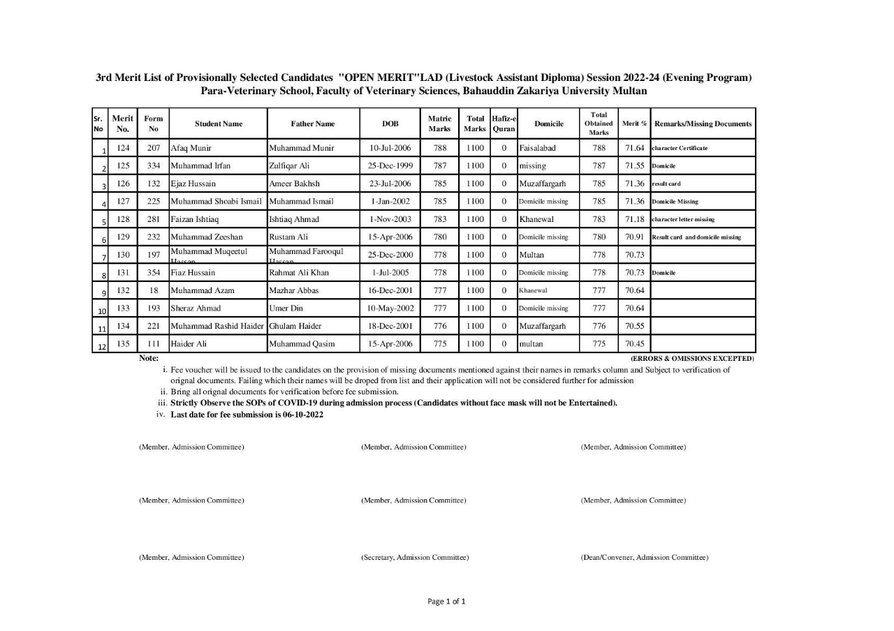 The Bahauddin Zikriya University of Multan has issued the 3rd Merit List of shortlisted candidates for the Livestock Assistant Diploma (LAD) Session 2022-24. The Merit List is for the LAD Morning and Evening programs in Layyah and Multan, respectively.