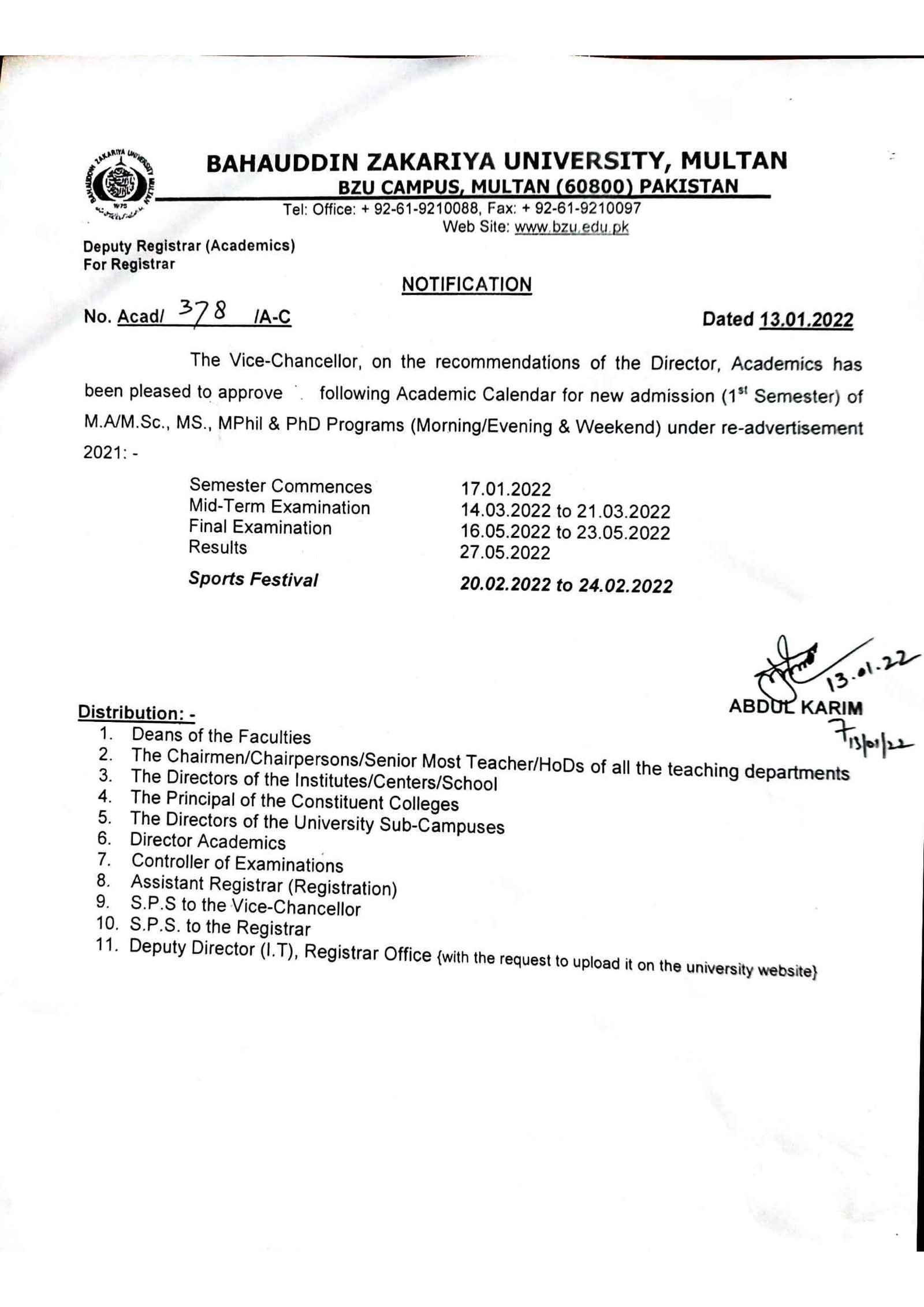 Check out the detailed academic calendar issued by BZU. The details are as under