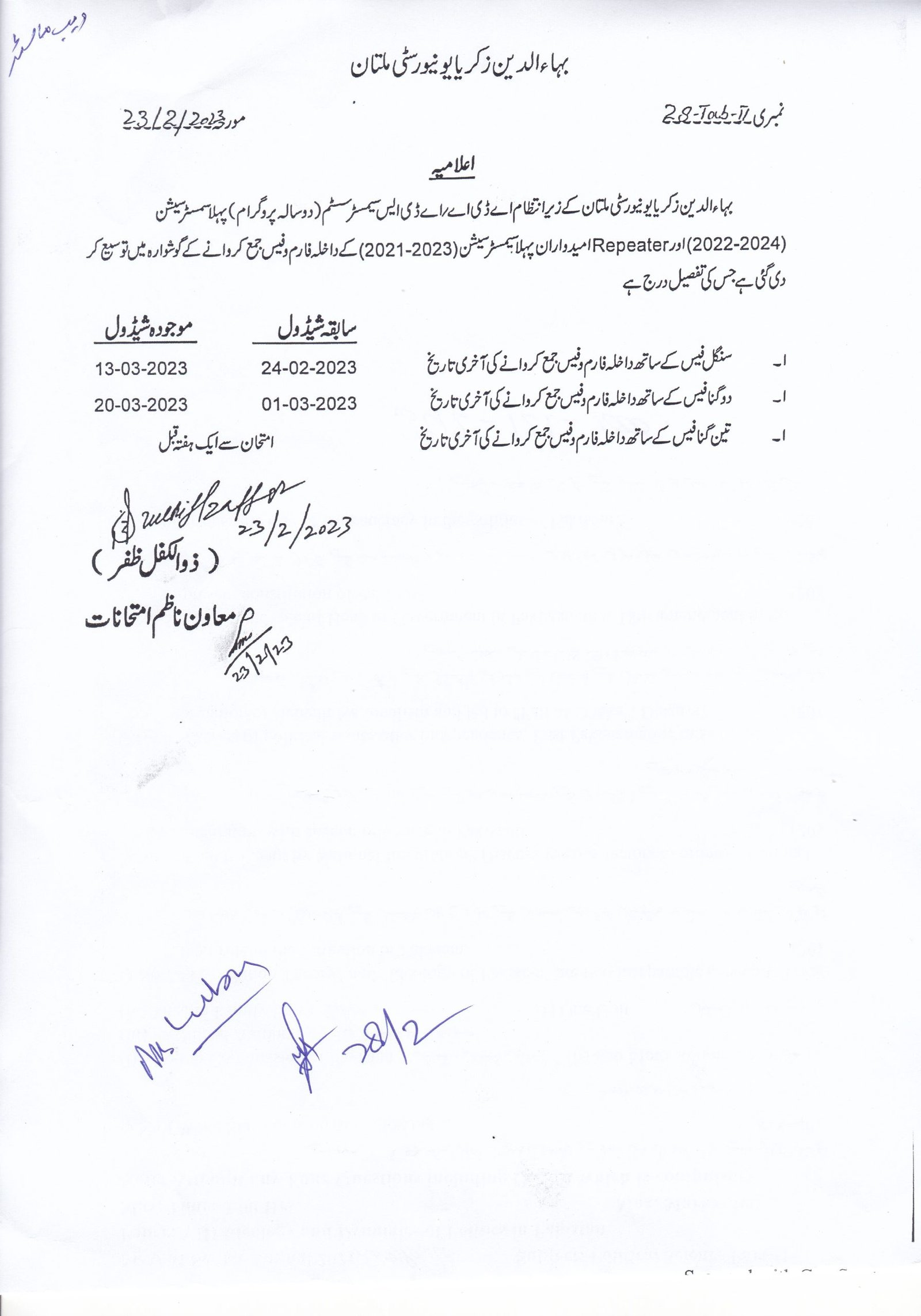 The Bahauddin Zakariya University BZU Multan issued the revised notification regarding the admission schedule of multiple programs for session 2023. The notification, it is to inform you all that the BZU issued the schedule of registration form submission of programs ADA, ADS (2 years) semester system for session 2023-24. Not only this, they also issued the schedule for repeaters of 2021-23 as well. As per schedule, the date of submission of single fee is 13th March 2023, while the date of double fee submission is 20th March 2023. The candidate who fails to submit the date will submit the triple fee one week before the commencement of exams. To get the detailed BZU Form Submission Schedule 2023, keep scrolling.