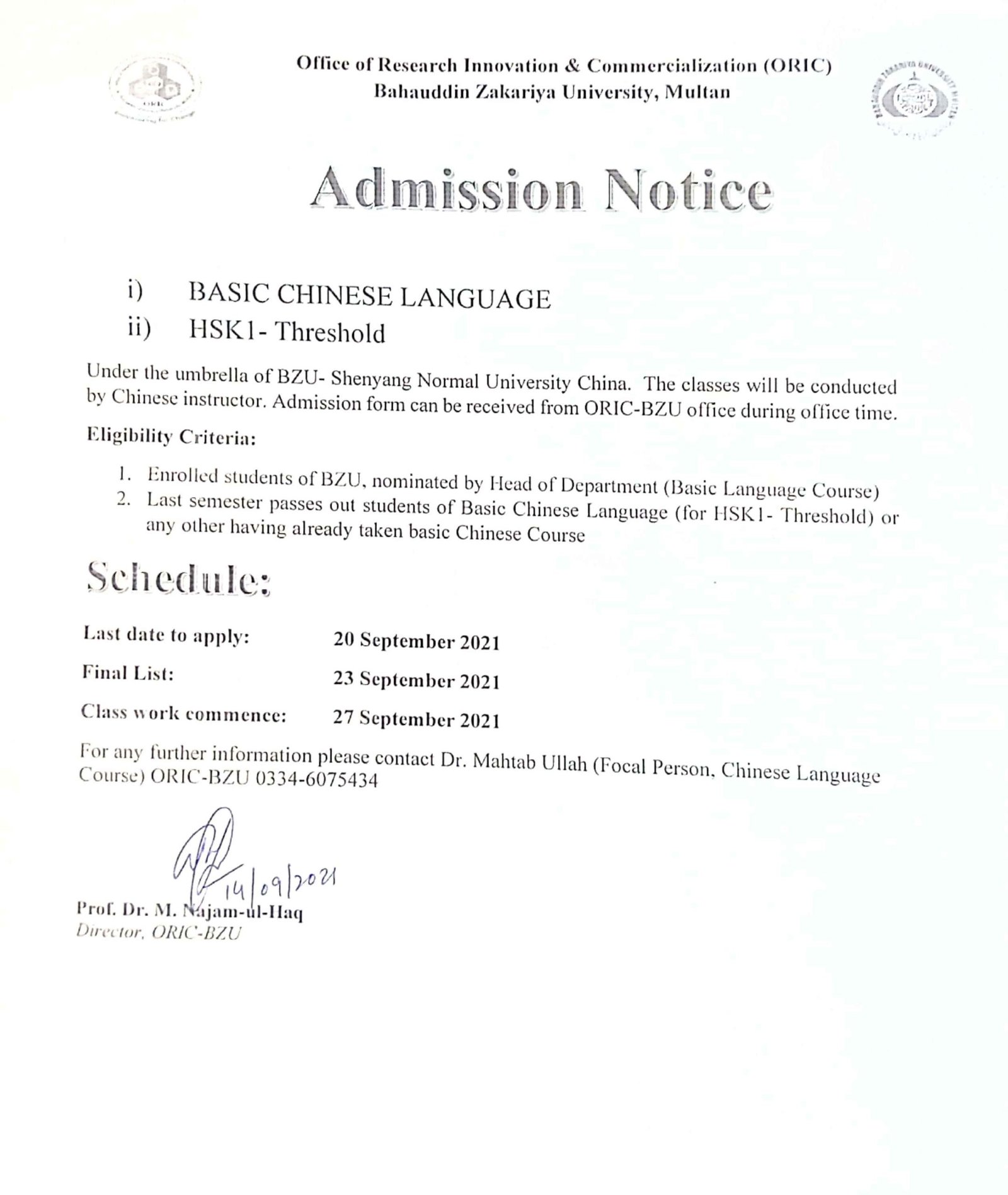 Are you looking for admission in a basic Chinese language course? If your answer is yes, then you are absolutely at the perfect place. Bahauddin Zakariya University BZU open admission in  Basic Chinese Language and HSK-I. Applicants who want to get admission in such a prestigious university will apply now by following general terms and conditions. The Chinese will be conducted by professional Chinese instructors. The interested candidates can receive an admission form from ORIC-BZU during the office time. The last date to apply is 20th September 2021. Bahauddin Zakariya University BZU will upload a merit list on 23rd September 2021. The classes will commence from 27th September 2021