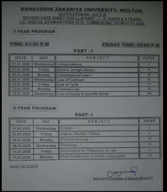 Bahauddin Zakariya University, Multan has announced the revised date sheet for LLB Programs. The BZU has announced the date sheet for both LLB programs, a 5-year program and a 3-year program.