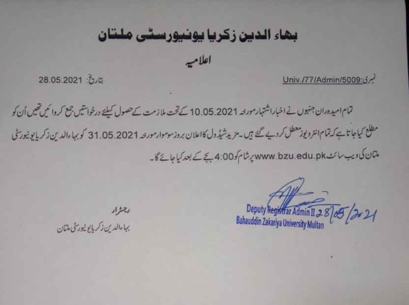 On 28 May 2021, Bahauddin Zakariya University Multan Issued the notification regarding the job interviews. The university has postponed the interviews for the job positions that were advertised on 10 May 2021. However, the university didn’t announce any further schedule for the interviews.