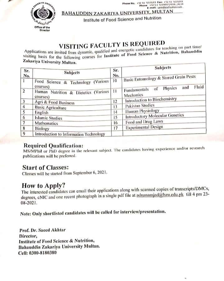 The Bahauddin Zakariya University (BZU) Multan announced the jobs of visiting faculty for different subjects. The announced posts are for the BZU Institute of Food and Nutrition. For the mentioned institute, the university requires teachers as a visiting faculty for various subjects mentioned below. Thus, interested and qualified candidates can apply by sending their documents to the official email. However, the last date for the BZU Multan jobs is 23 August 2021.