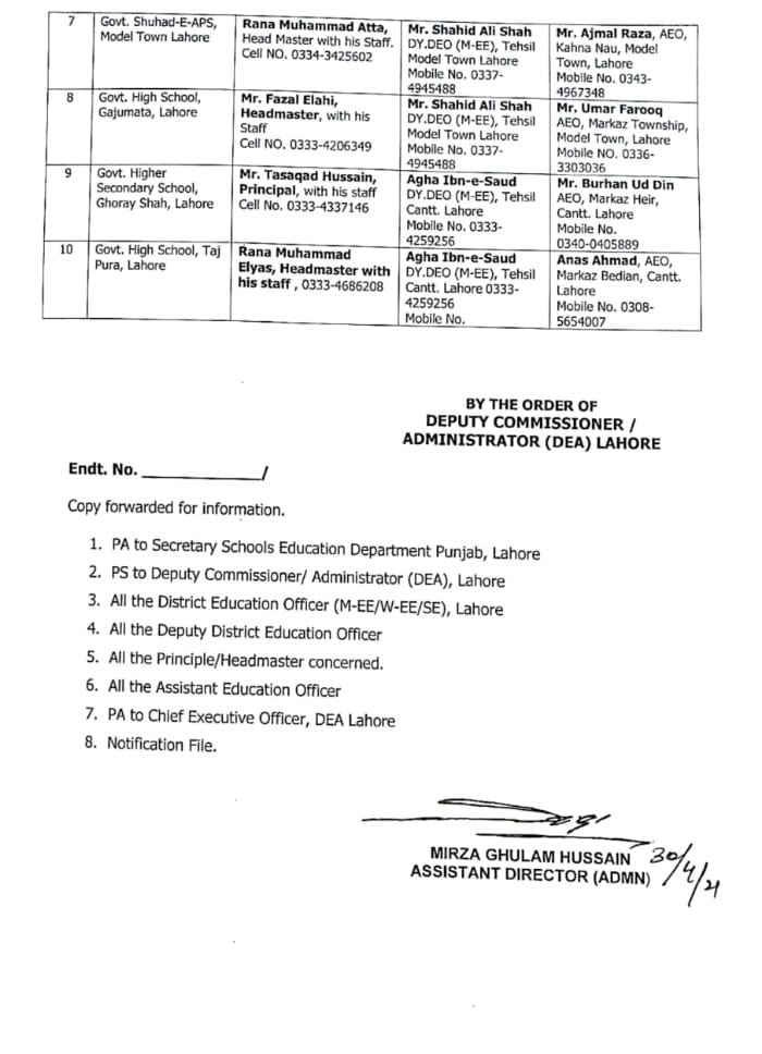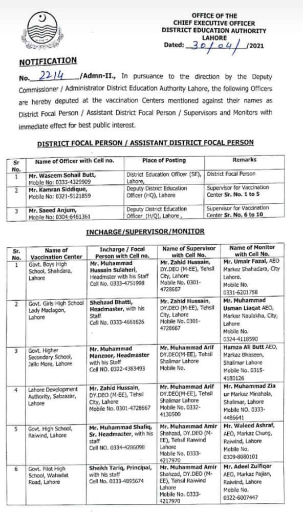 District Education Authority Lahore issued a notification on 30 April 2021 under the notification No. 2214/Admn-II. The notice stated that Deputy Commissioner/ Administrator DEA Lahore appointed DEOs and officers as focal persons/supervisors for the Vaccination centers. However, these are COVID-19 vaccination centers. Thus, below are the details of those appointed officers.